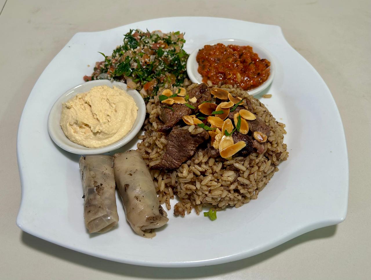 plato arroz cordero: 2 indios de repollo, ensalada tabule, tahine garbanzo, crema de berenjena, arroz cordero y pan