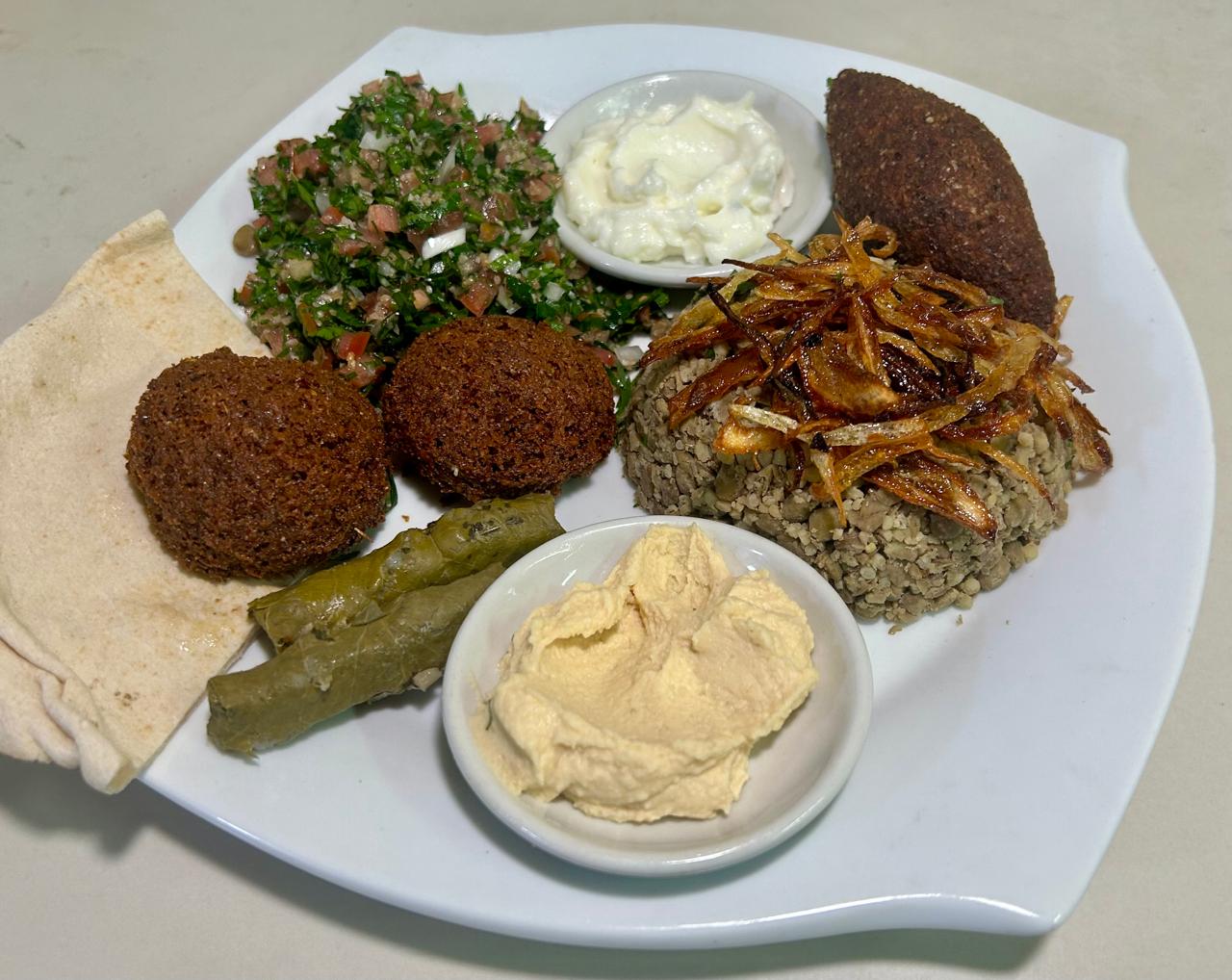 Plato vegetariano: 2 falafel, 2 indios vegetarianos, 1 quibbe vegetariano, arroz con lentejas, cebolla caramelizada, ensalada tabule , tahine garbanzo ,crema de berenjena y pan